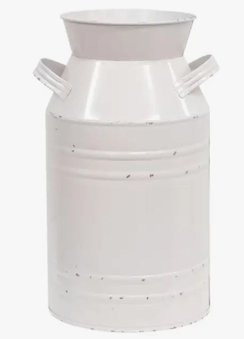Display flowers in the farmhouse with ease with the versatile Shabby Chic Metal Milk Can, Medium. This classic white milk can is metal with light distressing and has two sturdy handles on each side. Fill with cute decorative items on dowels and sticks or create a classic floral display.