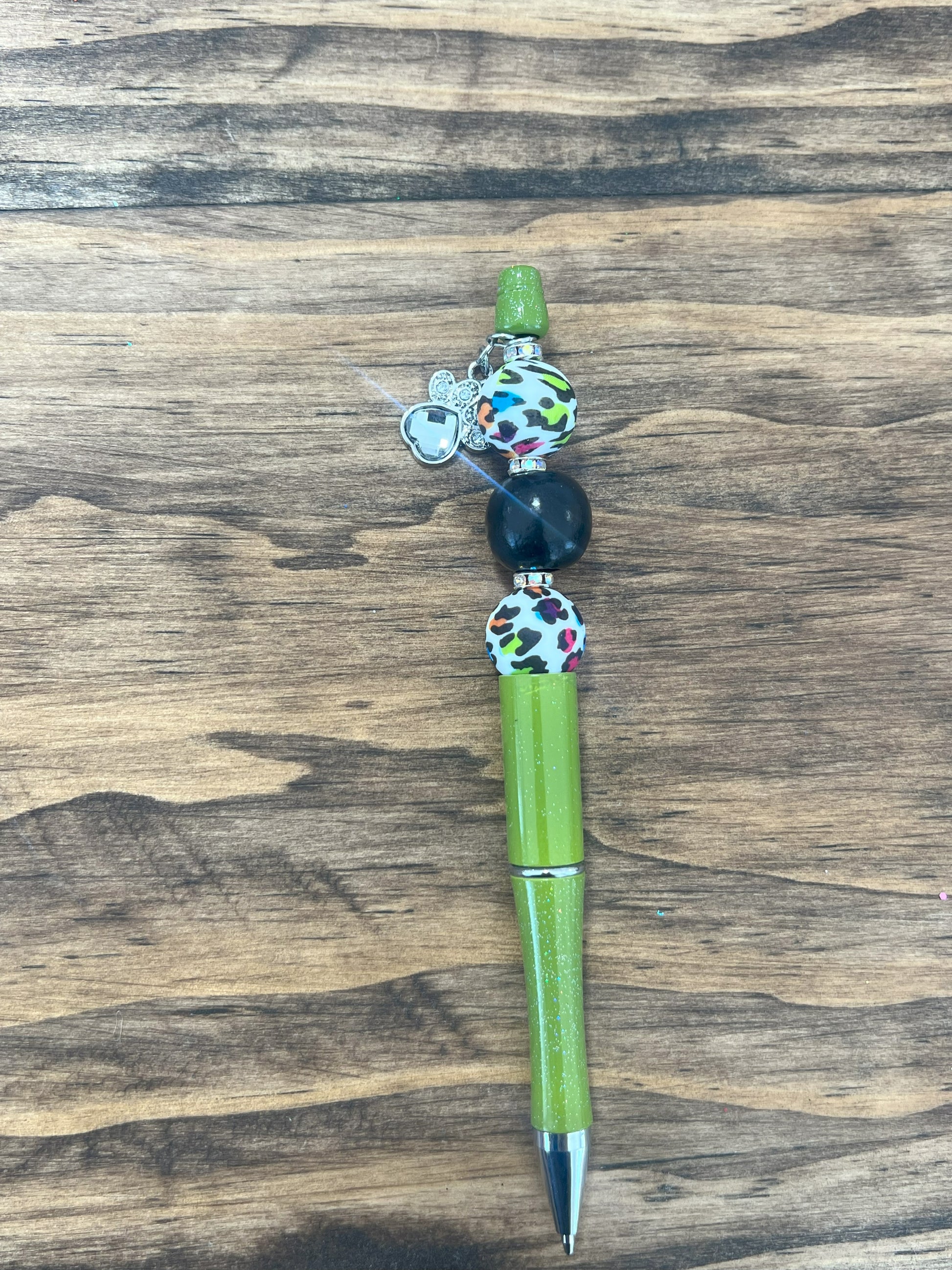 Green shimmer pen. Multi-color cheetah silicon beads with bling spacers. and a bling dog print charm