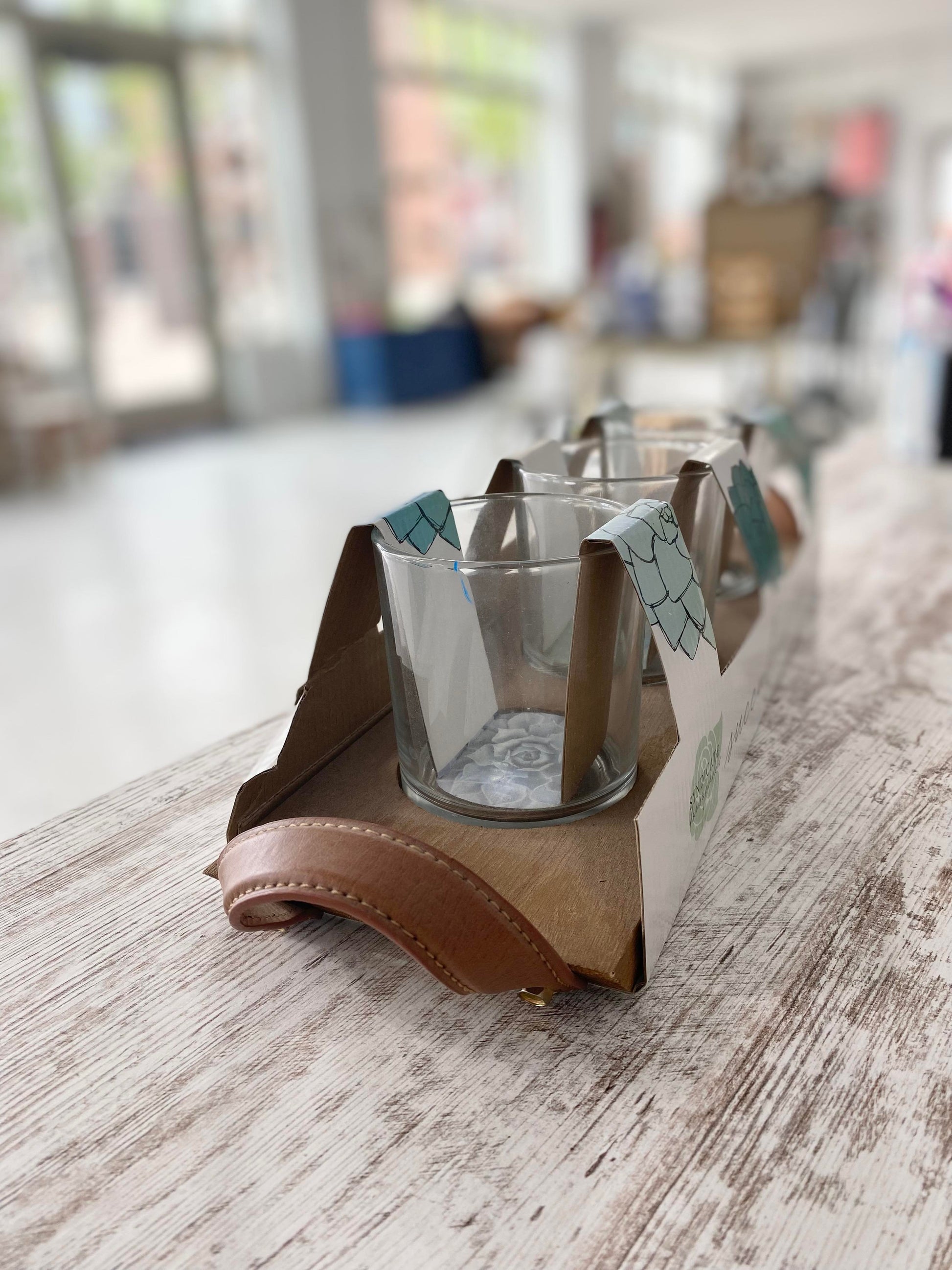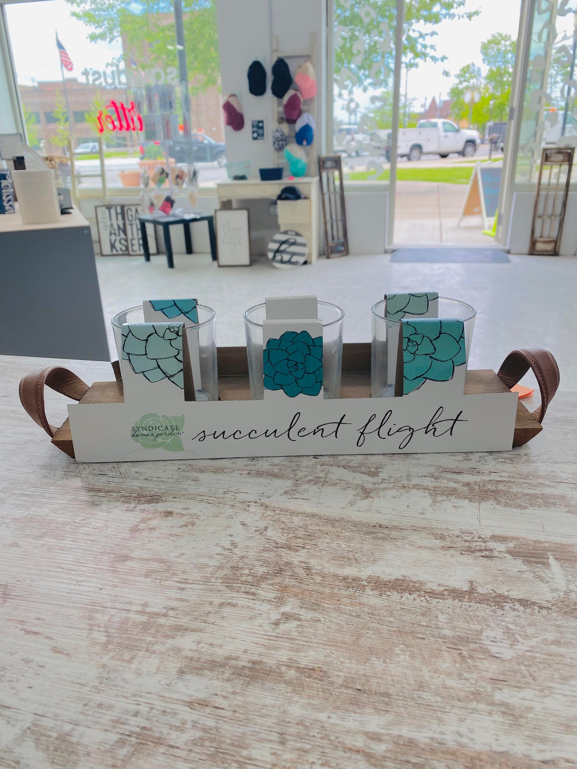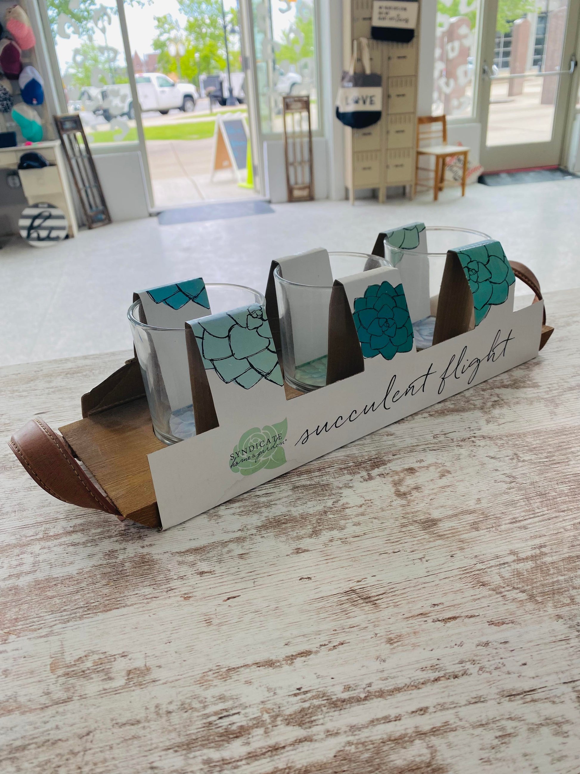 Beautiful Succulent flight set, can also be used for a drink flight.  3 glasses with a wooden holder, the wooden flight tray has 2 leather handles!